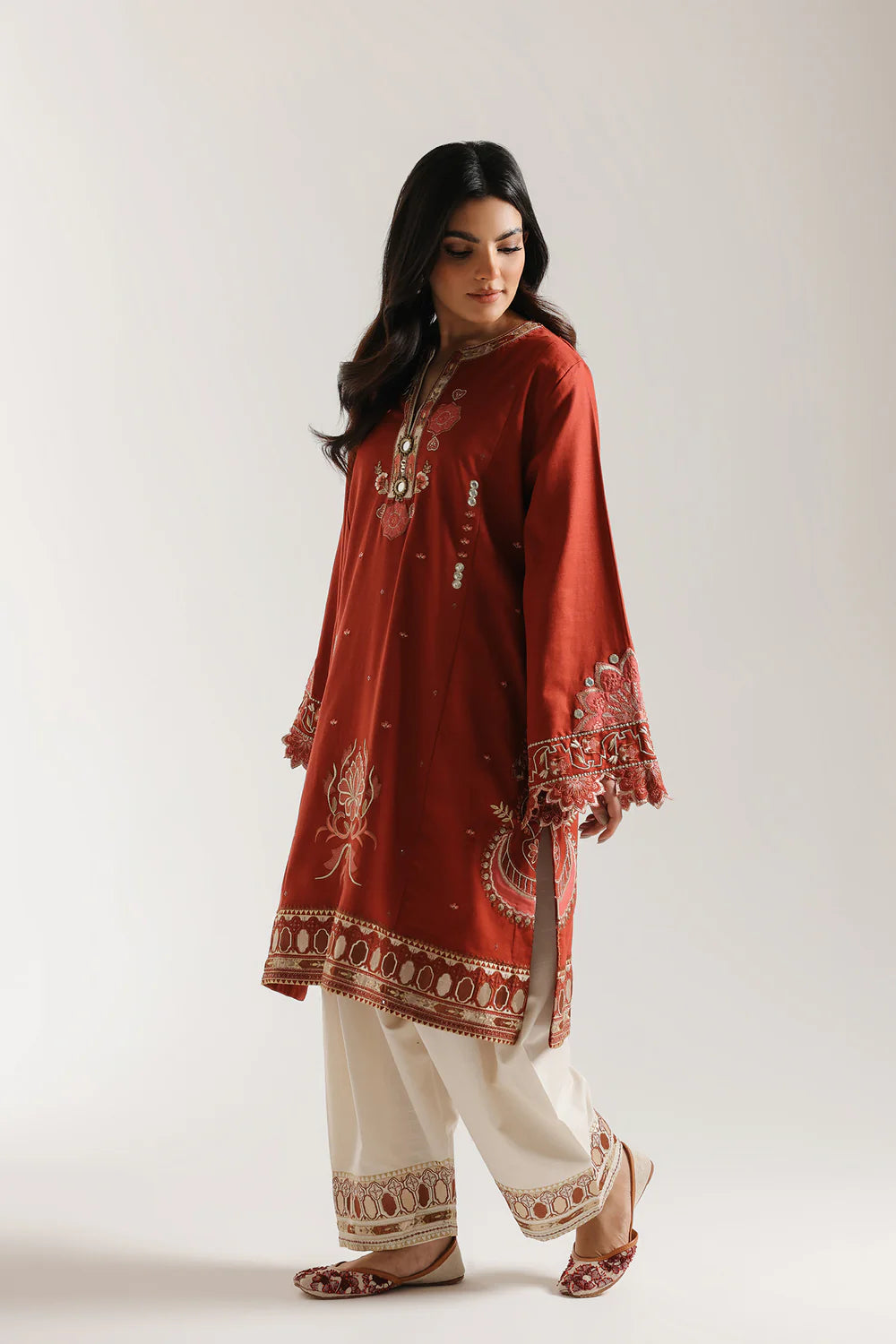 Elevate your traditional wardrobe with this sophisticated embroidered suit. The rich brown shirt features intricate embroidery adorning the neckline, hem, and sleeves, complemented by delicate scalloped detailing that adds refined elegance. Paired with a crisp white shalwar embellished with an ornate embroidery border, this ensemble strikes the perfect balance between classic craftsmanship and contemporary style. Ideal for formal occasions, celebrations, or everyday sophistication, this coordinated set showcases meticulous attention to detail and premium construction quality.