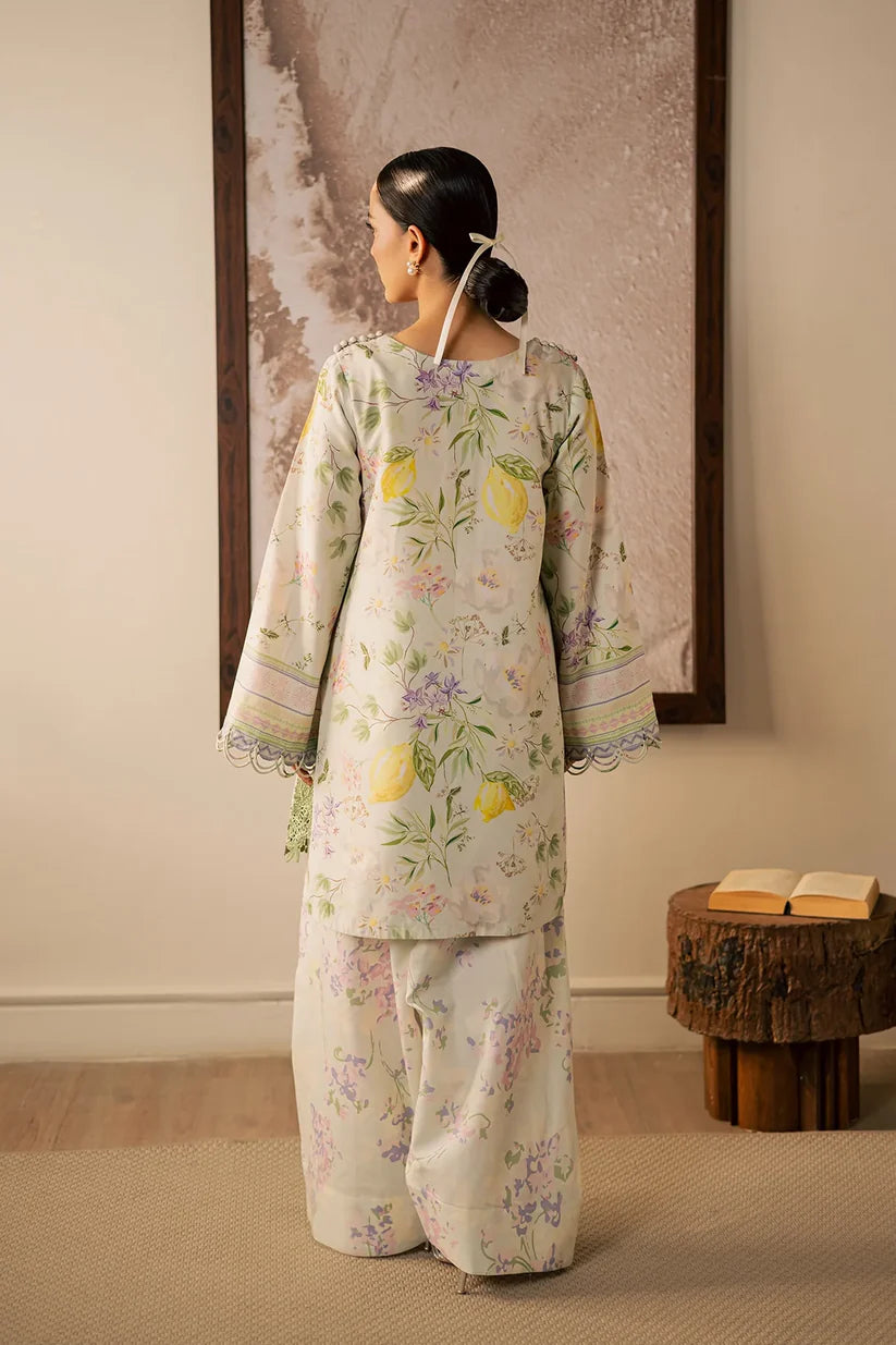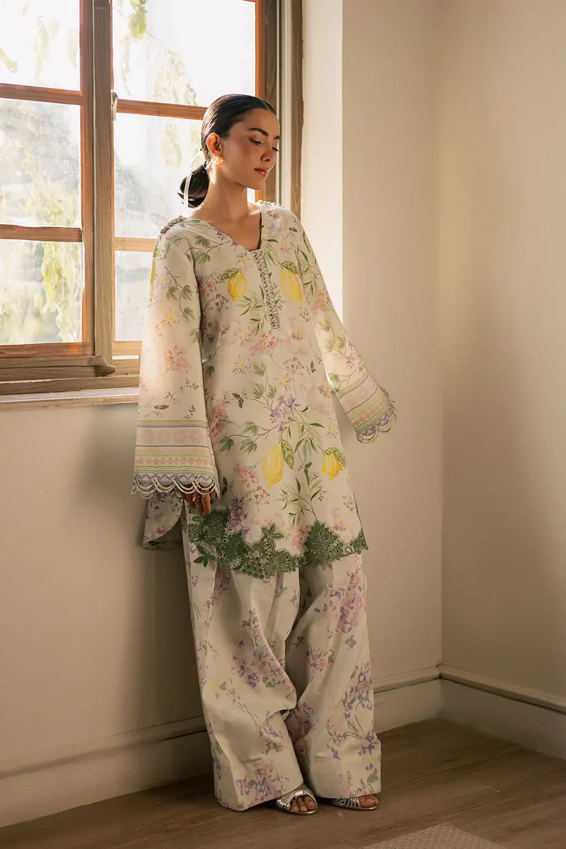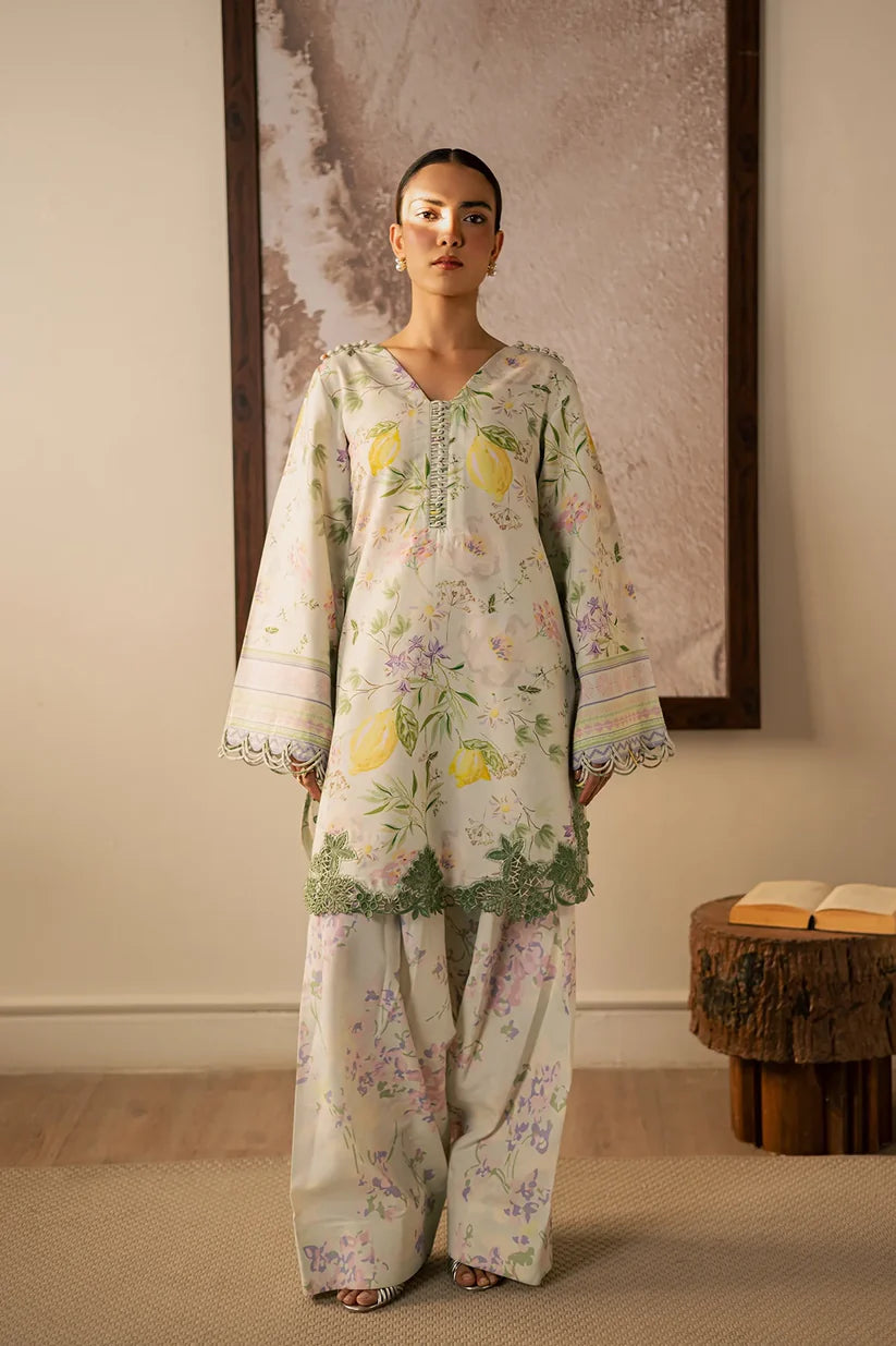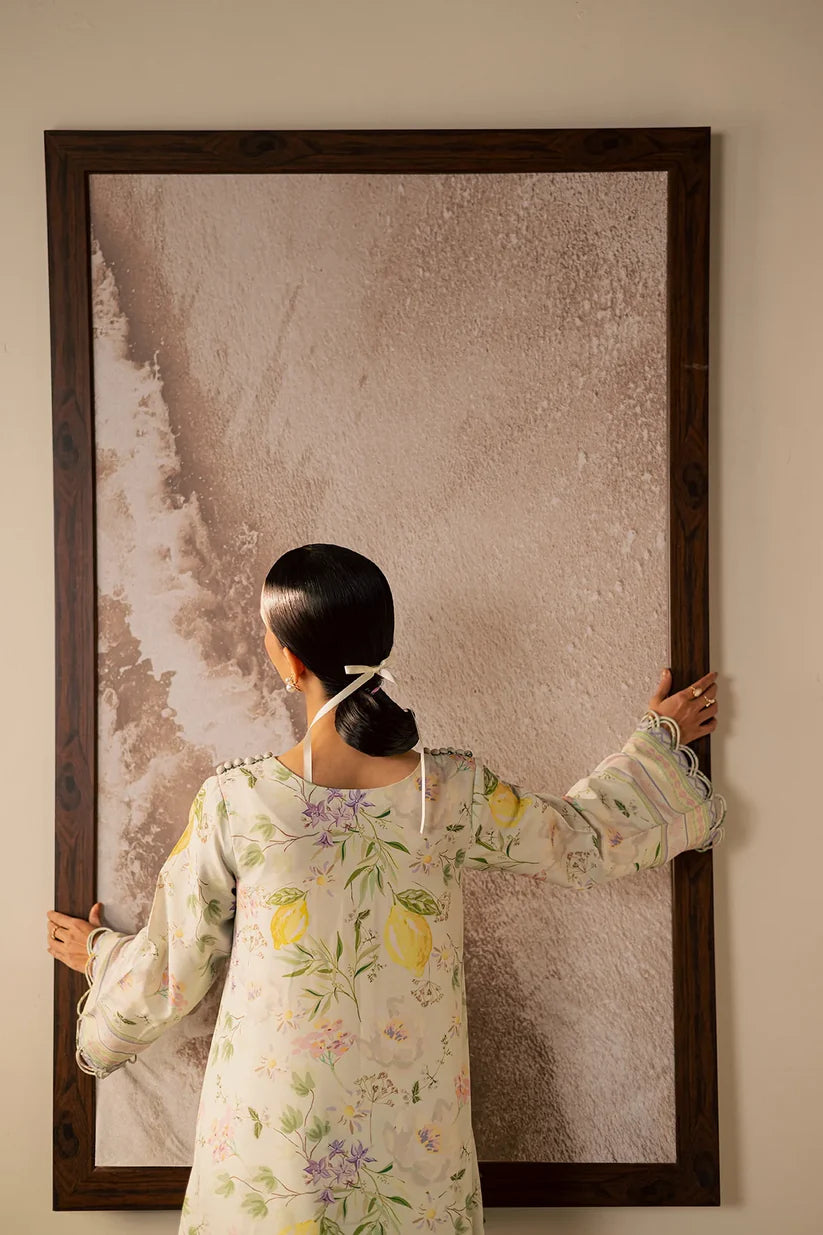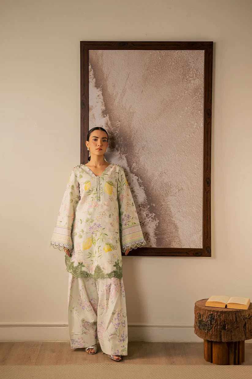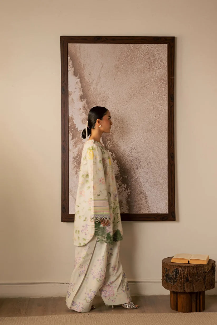 Embroidered and printed lawn silk shirt paired with printed lawn slik trouser.
