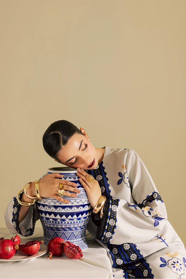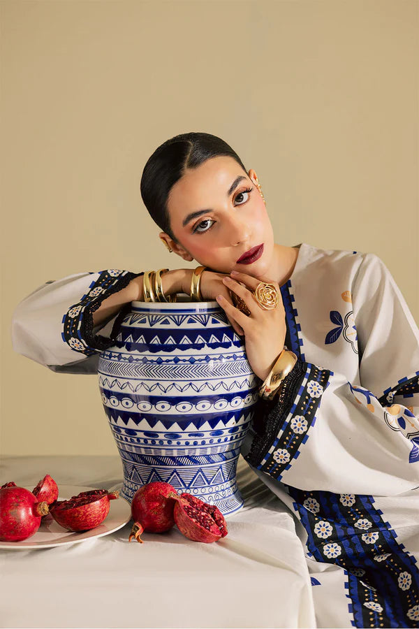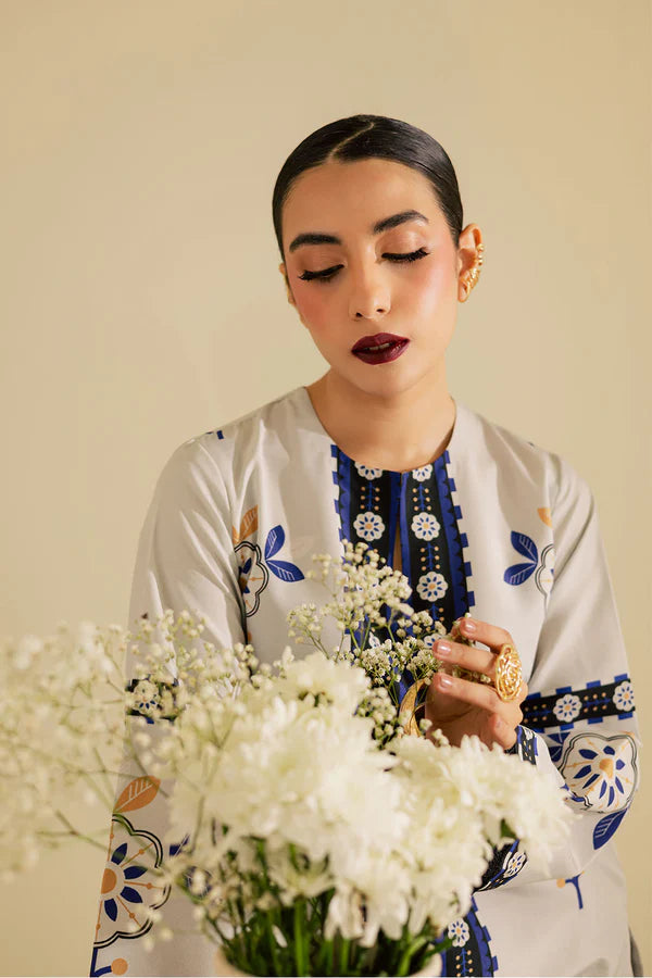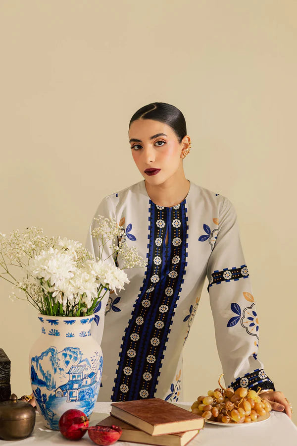 Printed long shirt with lace detailing on daman and sleeves, paired with straight pants