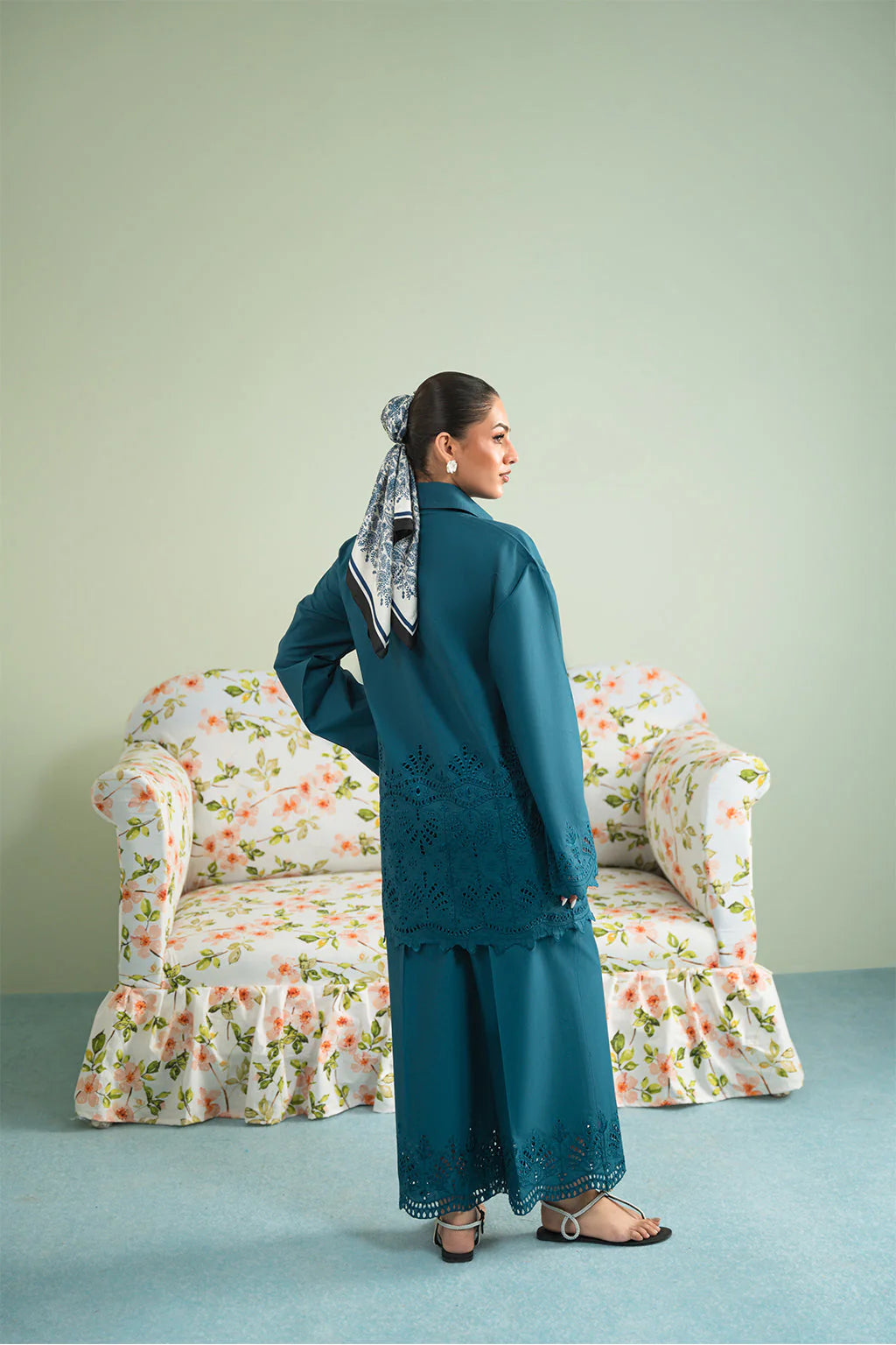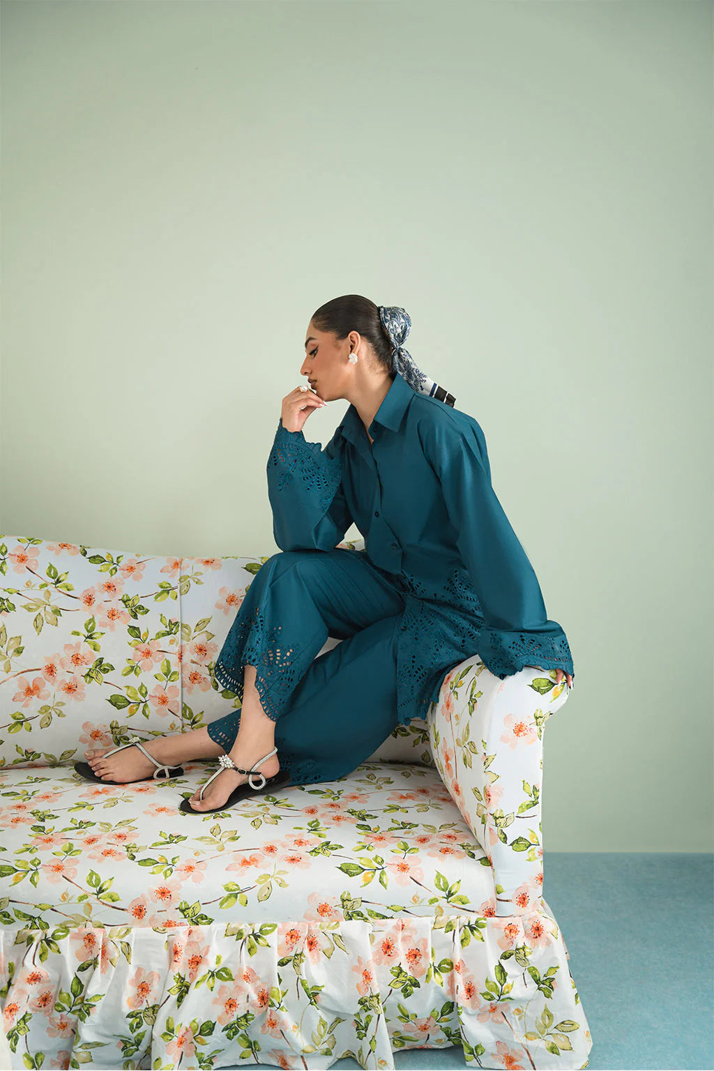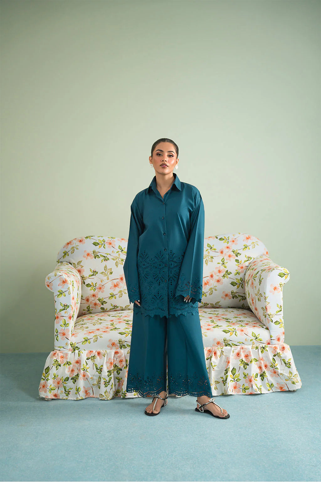 A teal green schiffli embroidered button down shirt made from premium cotton, paired with schiffli trouser