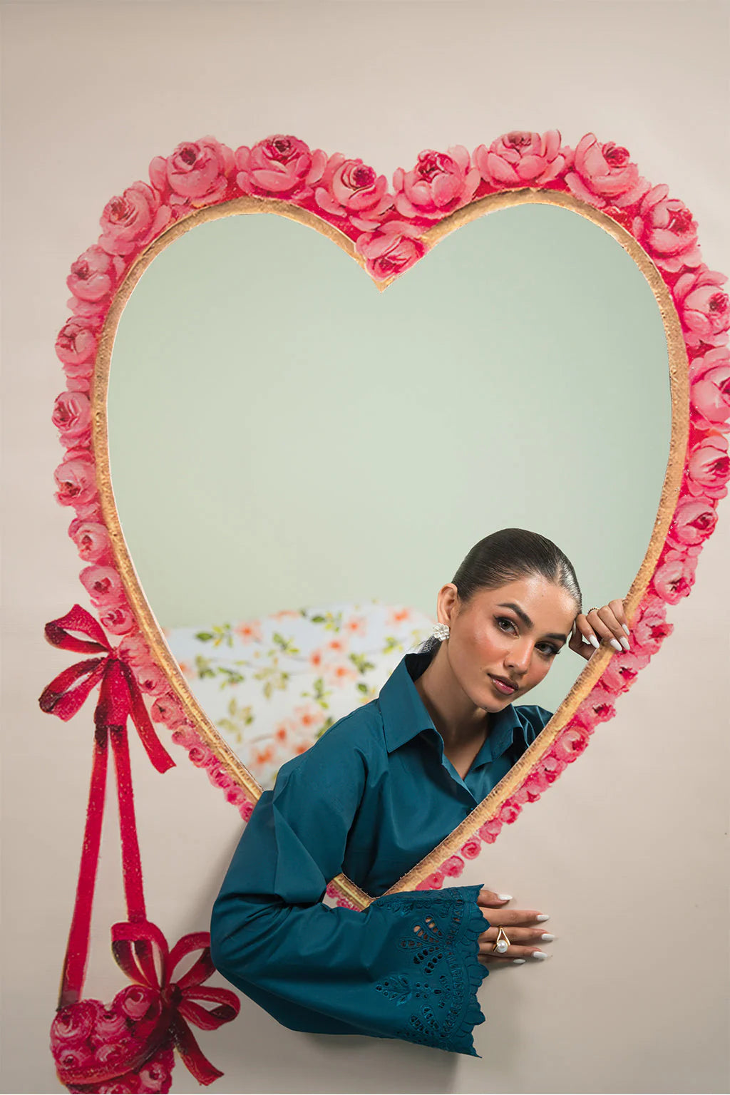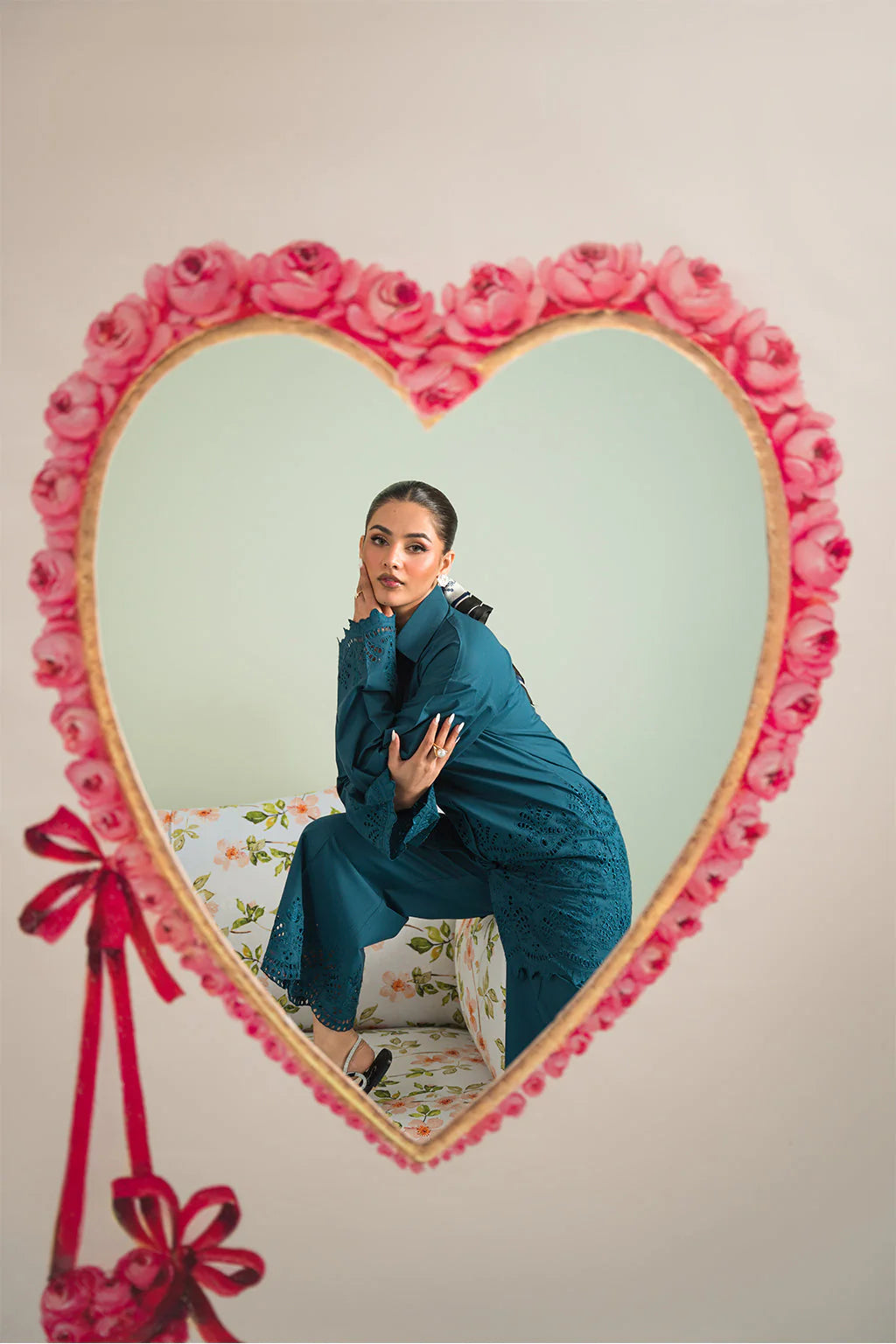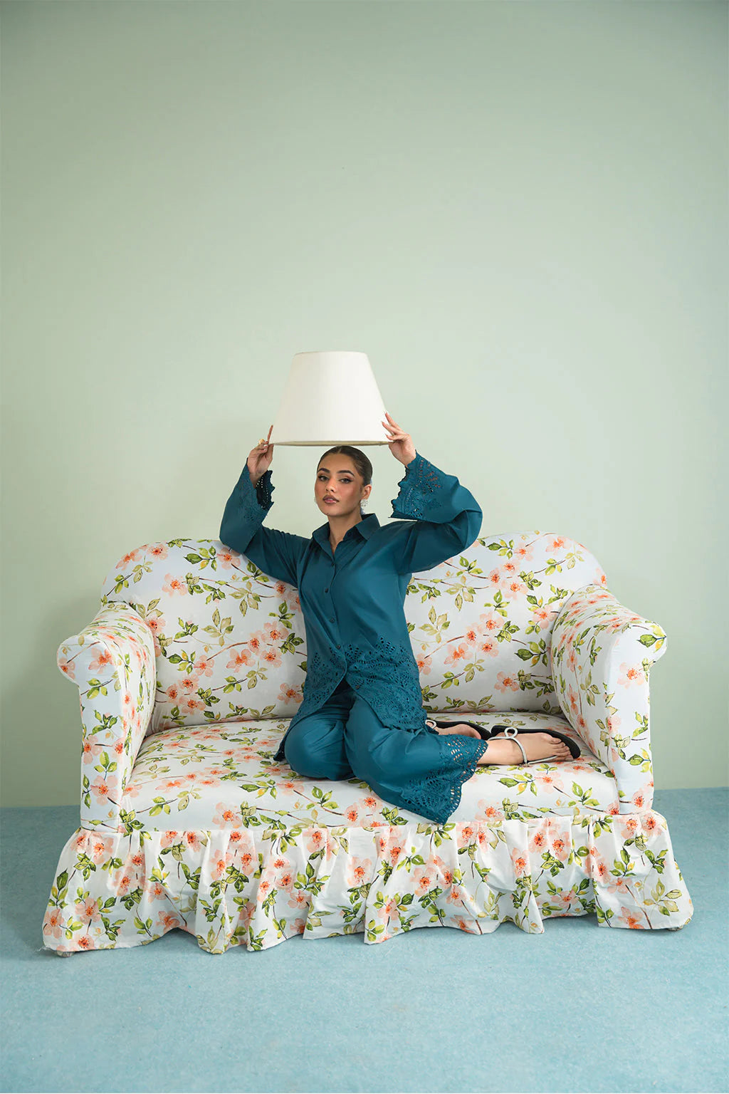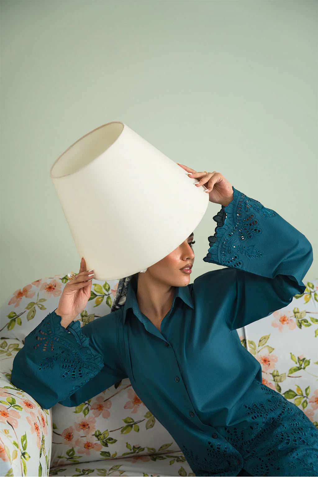 A teal green schiffli embroidered button down shirt made from premium cotton, paired with schiffli trouser