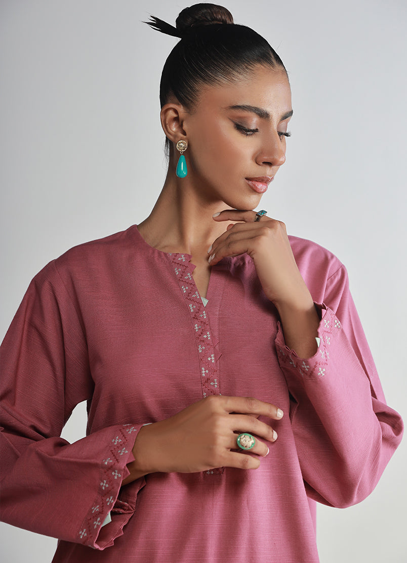 The Pink Embroidered Co-Ord Set from our Legends of Fall '24 Collection. A straight silhouette, round neckline with a slit, embroidered sleeves paired with culottes.
