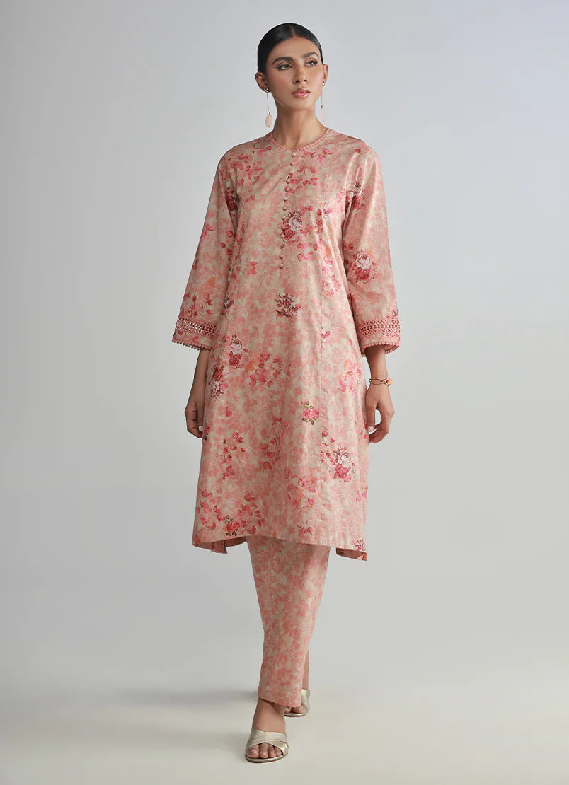The Dull Peach Floral Printed Co-Ord Set from our Spring Basics '25 Collection. A straight silhouette, round neckline with button finishing & lace embellishment, quarter sleeves with lace embellishment paired with trousers.