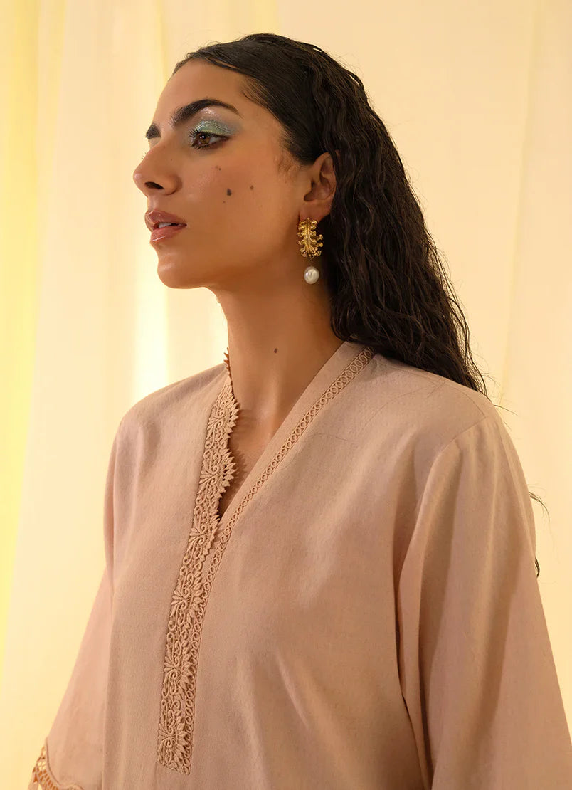 The Tan Peach Jacquard Solid Co-ord Set from our Spring Collection '25 Collection features a solid shirt with V neckline, three-quarter sleeves, paired with a straight shalwar.