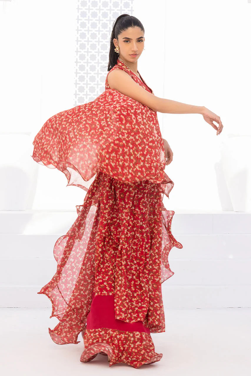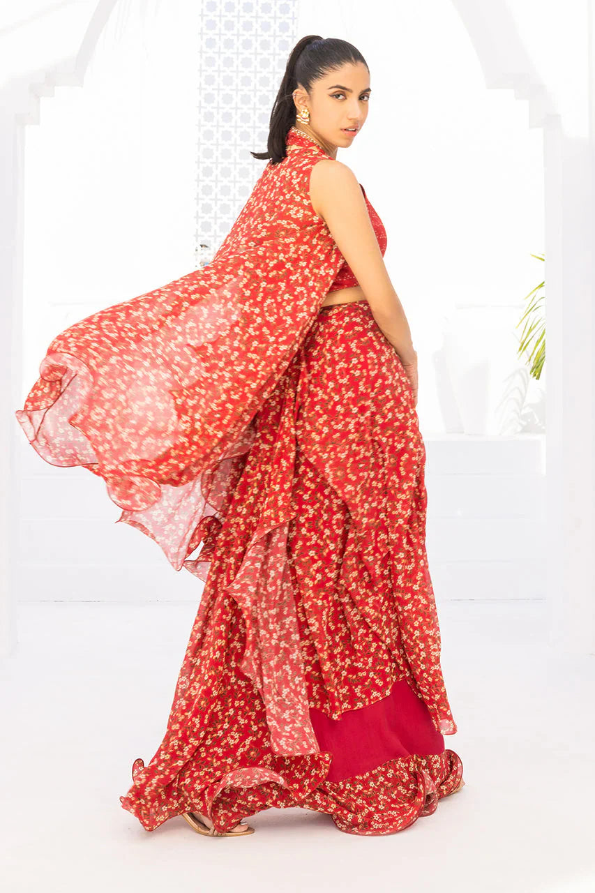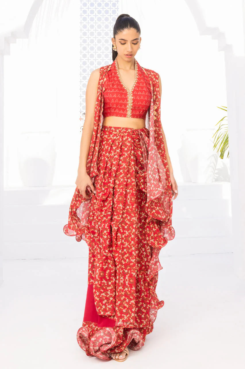A cherry red khaddi silk choli, touched with delicate handwork is paired with a printed georgette ruffled skirt and jacket. The colourful co-ord set is fun and bold, modern and versatile.