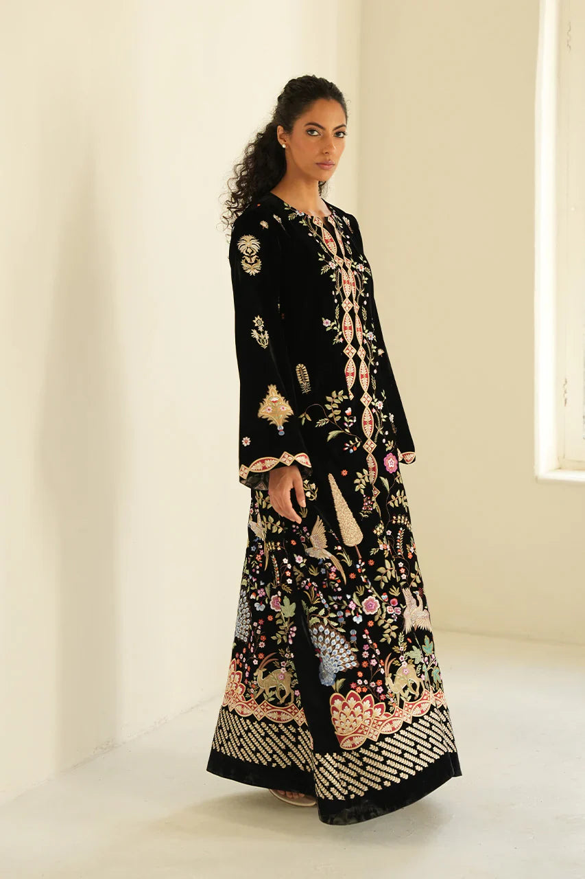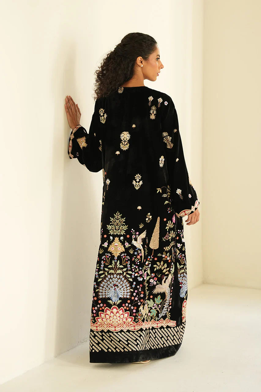 Bathed in the opulence of a moonlit onyx, a resplendent velvet kaftan is intricately embroidered with ornate florals and majestic birds in contrasting tones. Crimson applique details grace the neckline and hem, evoking regal grandeur.
