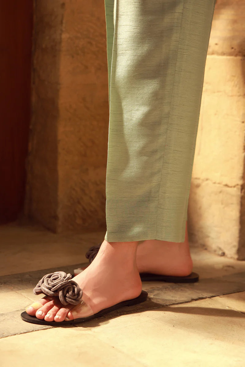 A modern cut organza short-length shirt with front embroidery, featuring an organza bow detail on the neckline and embroidered balloon sleeves, paired with raw silk culottes.