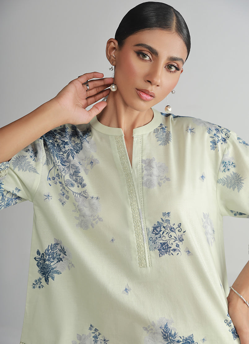 The Light Lime Floral Printed Co-Ord Set from our Legends of Fall '24 collection. A knee length shirt, round neckline with slit, lace embellishment on neckline, sleeves & hemline, paired with breezy culottes.