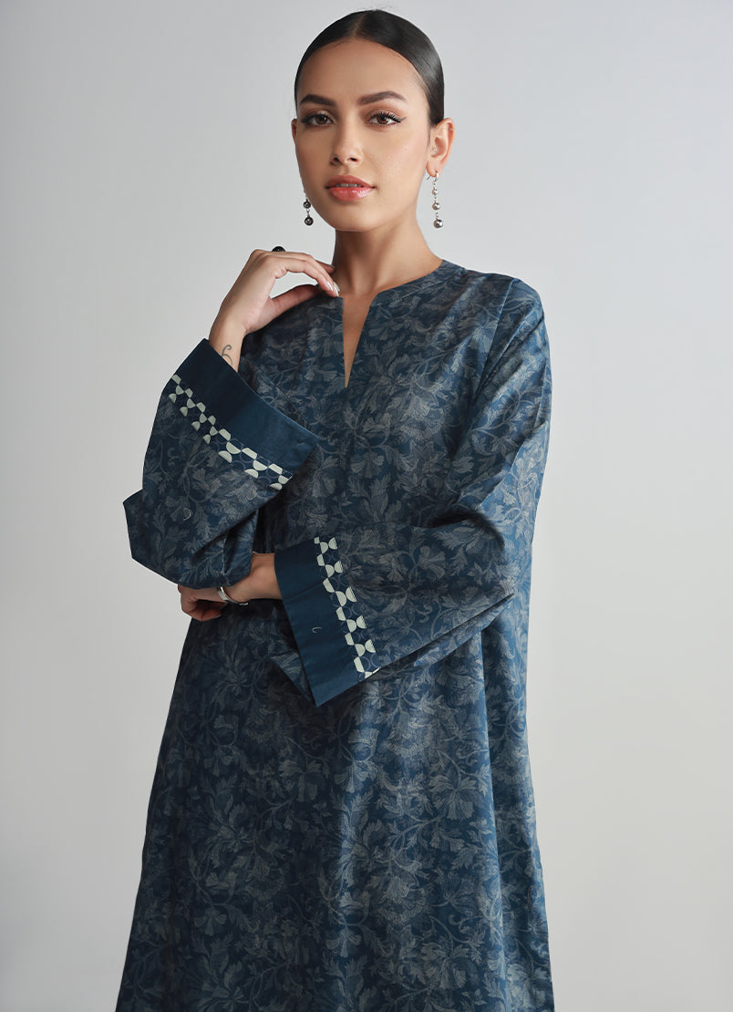 The Dark Blue Floral Printed Co-Ord Set from our Legends of Fall '24 collection. A knee length shirt, round neckline with slit, full-length bell sleeves paired with a shalwar.