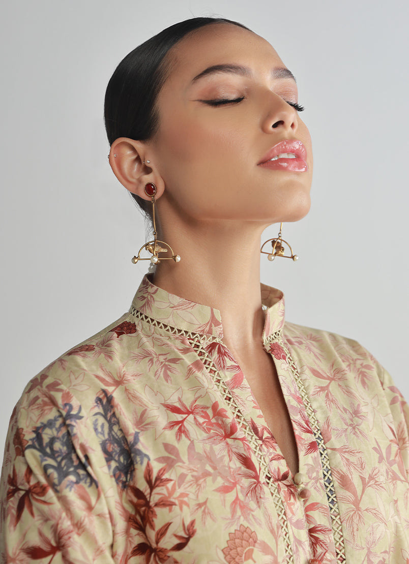 The Light Olive Floral Printed Co-Ord Set from our Legends of Fall '24 collection. An A-line shirt, band collar finished with buttons, quarter bell sleeves, lace embellishment on neckline, sleeves & hemline, paired with a shalwar.