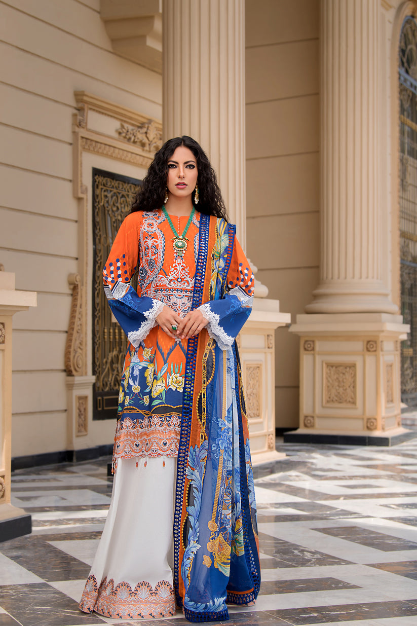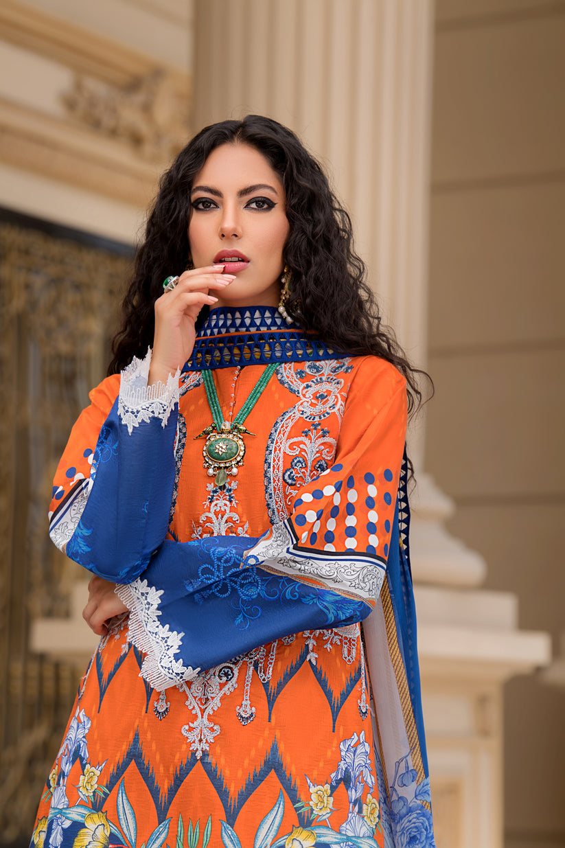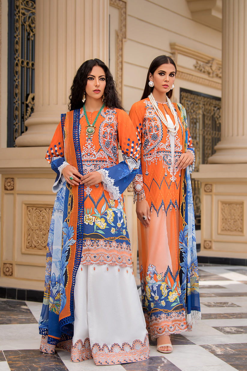 We are going all out with this vibrant orange and indigo ensemble featuring flora and fauna details like no other. Paired with crisp ivory bottoms decorated with subtle rustic details, this ensemble is nothing short of summertime magic!