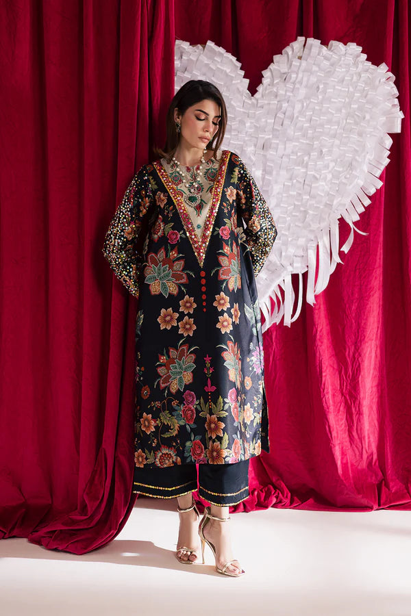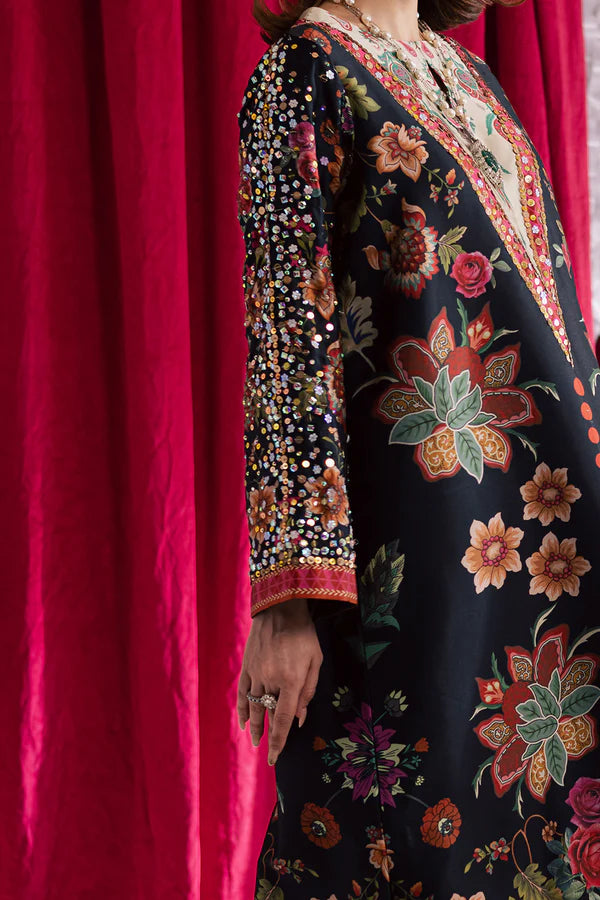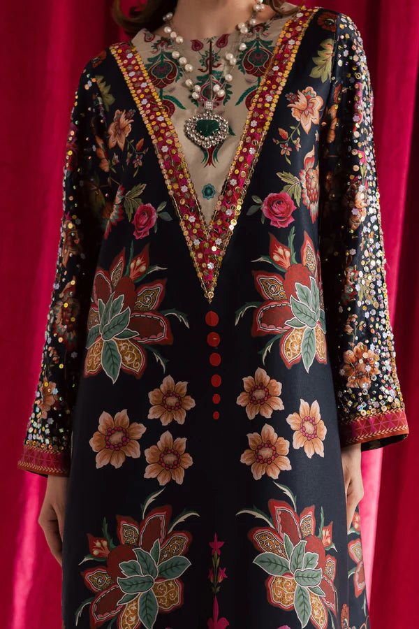 Printed silk shirt with intricate embellishments on the sleeves and neckline, paired with silk embellished straight pants for a refined and stylish ensemble.