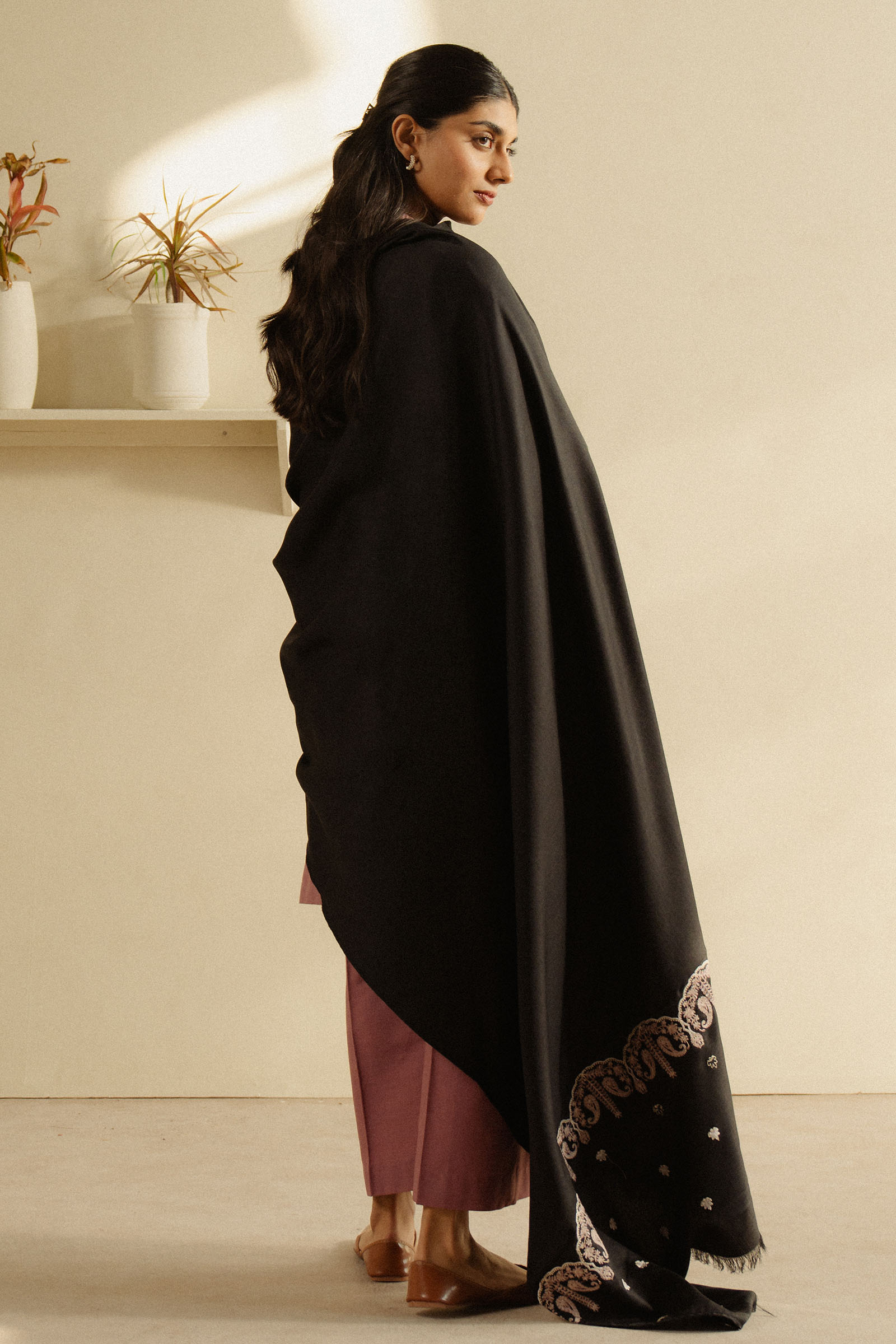 Our black shawl with an embroidered border is a classic piece to elevate your winter wardrobe.