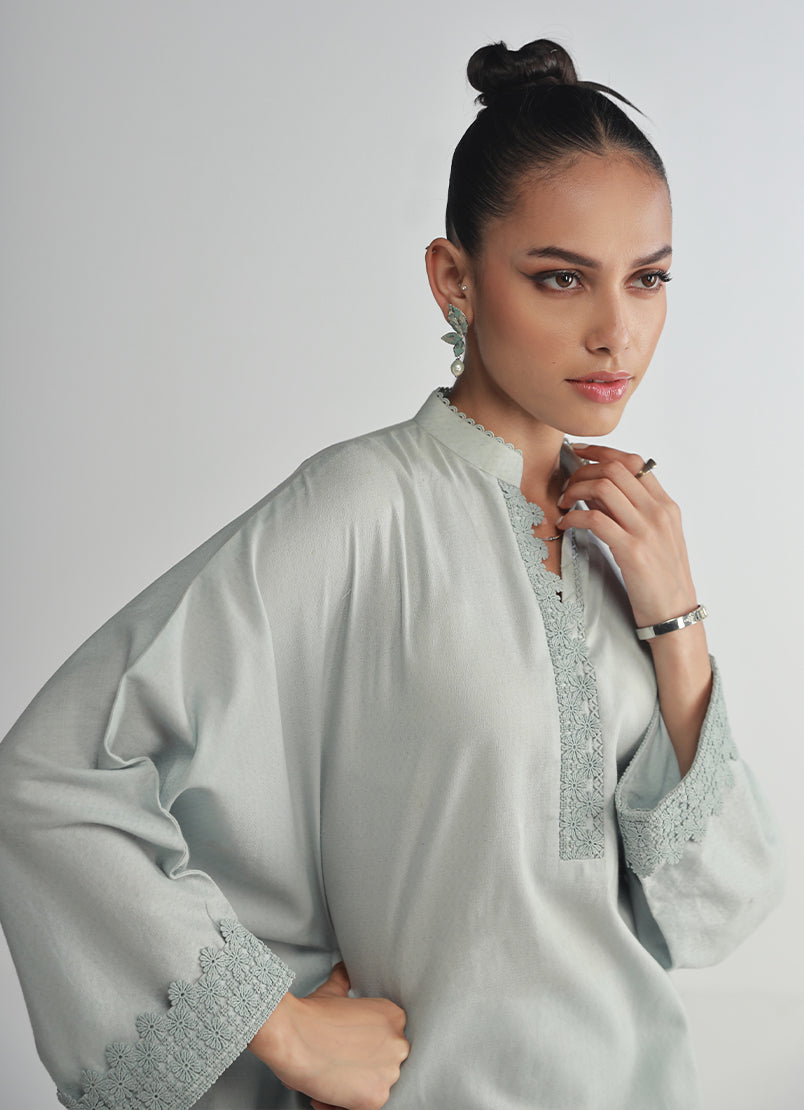 The Seafoam Blue Textured Co-ord Set from our Legends of Fall '24 Collection. A-line shirt, band collar, ful length bell sleeves paired with culottes.
