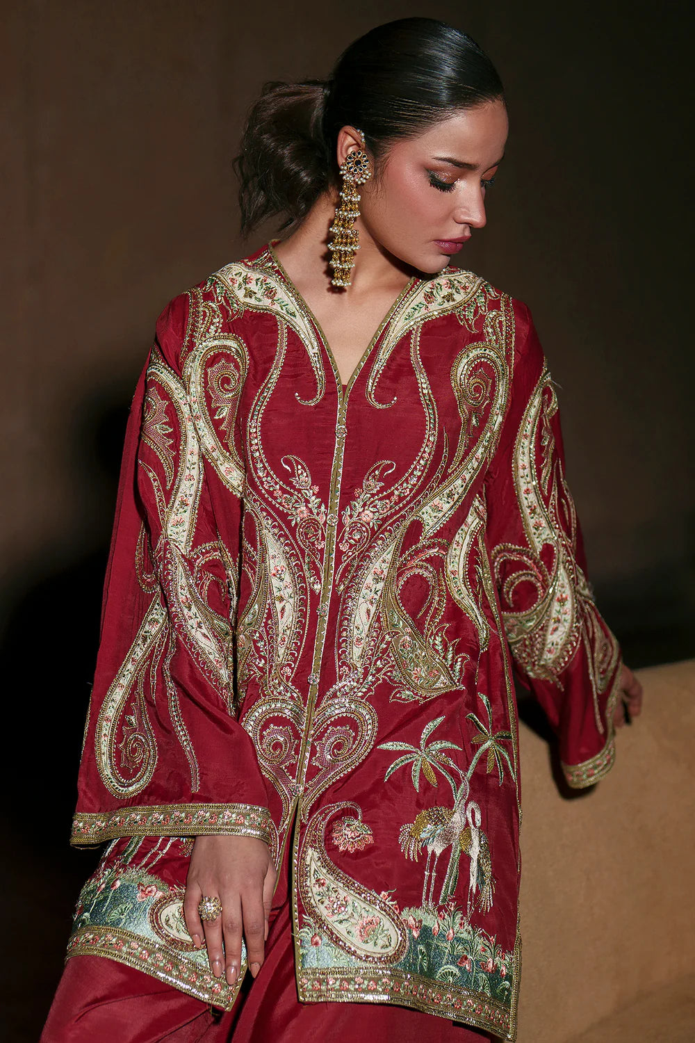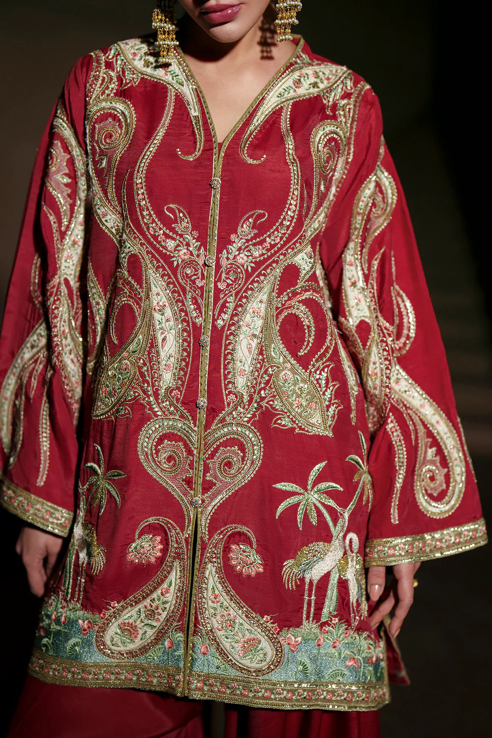This striking deep-red embroidered suit radiates regal sophistication. The elegant, long-sleeved tunic features a refined V-neckline and intricate, shimmering gold needlework that cascades across the front and sleeves. Paired with flowing tonal trousers, this breathtaking ensemble is a majestic choice for celebrations.